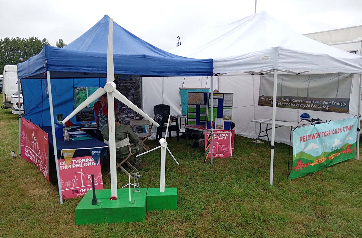 On Saturday 28th June, eight campaign groups joined forces at the Newtown Outdoor Festival to raise awareness of the huge number of windfarm and pylon proposals threatening the Welsh Heartlands. There were representatives from CPRW, RE-Think, Save Banc Du and Rhiwlas, Protect Glaslyn & Hafren, Caru Teifi, Save Garreg Hir, Wild Wales Trust and Intelligence Research Network.